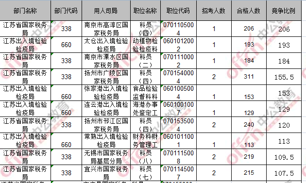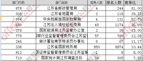 報(bào)名通過(guò)審核人數(shù)前十的職位主要集中在江蘇省國(guó)家稅務(wù)局、江蘇出入境檢驗(yàn)檢疫局,具體信息如下: