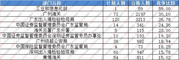 報名通過審核人數(shù)前十的職位主要集中在深圳海關(guān)、廣東省國家稅務(wù)局、廣州海關(guān),具體信息如下: