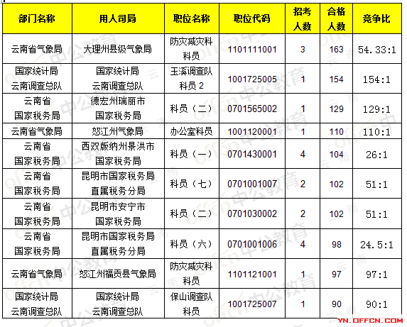 截止19日8時,招錄比例的職位為云南省氣象局,職位代碼是1101111001,招錄3人,通過人數163人,競爭比54.33:1
