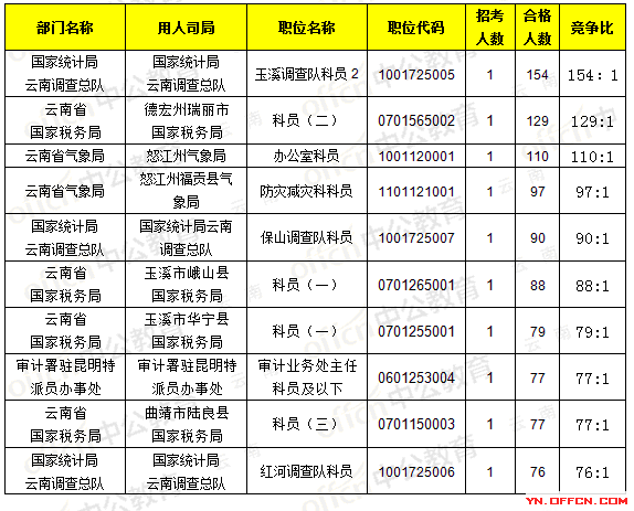 報名通過審核人數前十的職位主要集中在云南省氣象局、國家統計局云南調查總隊、云南省國家稅務局,具體信息如下: