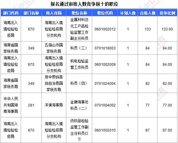 截止到19日8時,已有163個職位破0,且熱門職位人數競爭已經開始激烈,其中報名人數最多的職位為:海南出入境檢驗檢疫局,金屬材料及化工產品檢驗監管工作副主任科員,共報名133人,競爭比例已高達133:1!