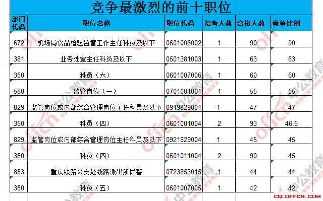 截止目前競爭最激烈的前十的職位相對前四天已經有很大的變化,具體信息如下: