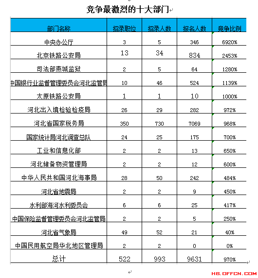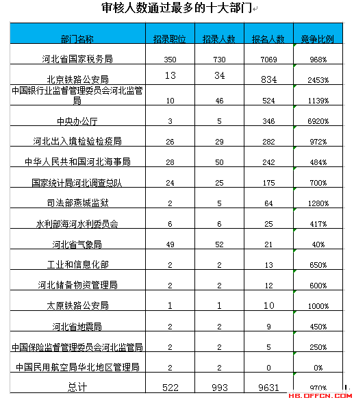 為幫助廣大考生更清晰的了解今日報名情況,河北中公網校整理了審核通過人數前十位的部門以及競爭比例最激烈的十大部門,供廣大考生參考: