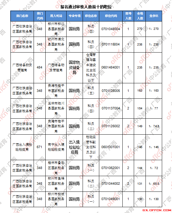 報名通過審核人數前十的職位主要集中在廣西壯族自治區國家稅務局、廣西儲備物資管理局、廣西出入境檢驗檢疫局等部門,具體信息如下: