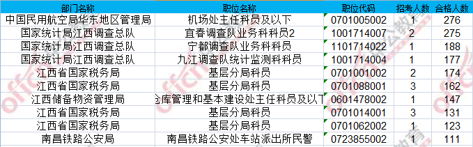 報名通過審核人數前十的職位主要集中在江西省國家稅務局、國家統計局江西調查總隊具體信息如下: