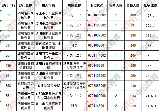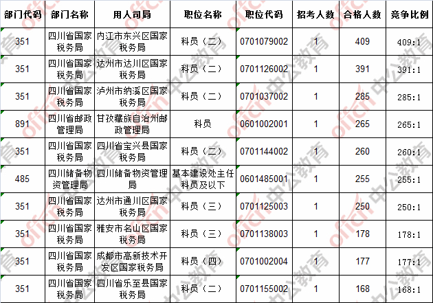 截止到19日16時,競爭比例的職位為‘內江市東興區國家稅務局科員(二)’一職,招錄1人,截止到19日16時通過人數為409人。