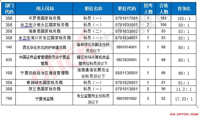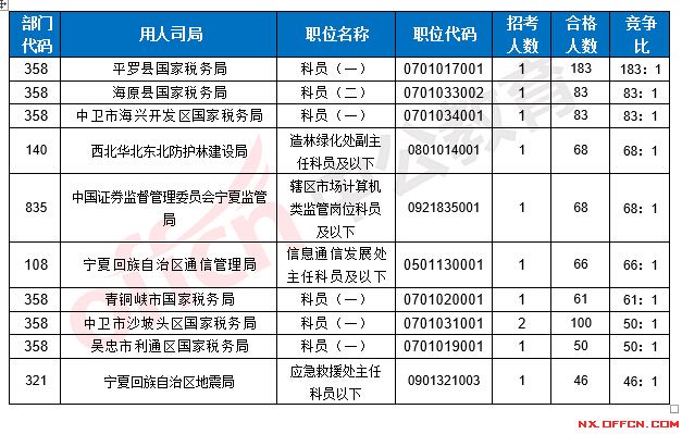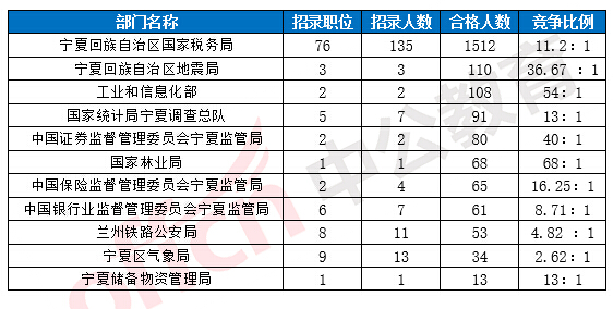 截止到19日16時,寧夏國考合格人數(shù)前三位的部門依次是:寧夏回族自治區(qū)國家稅務(wù)局、寧夏回族自治區(qū)地震局、工業(yè)和信息化部,銀川海關(guān)無人報考。