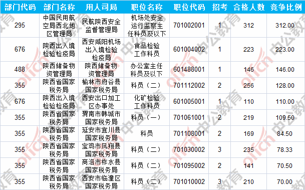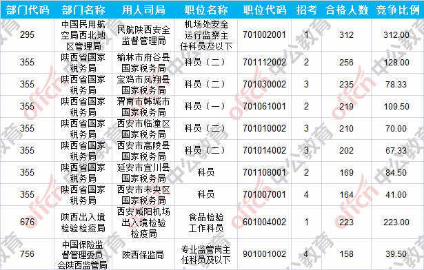 報名通過審核人數前十的職位主要集中在陜西出入境檢驗檢疫局、陜西省國家稅務局、中國民用航空局西北地區管理局等部門,具體信息如下: