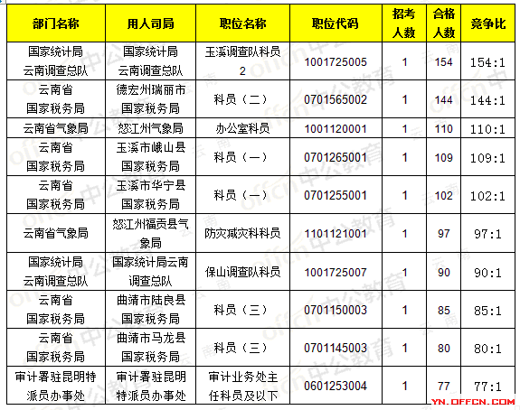 截止19日16時,競爭最激烈的職位為國家統計局云南調查總隊_國家統計局云南調查總隊(玉溪調查隊科員2),職位代碼1001725005,招錄1人,通過人數為154人,154:1。