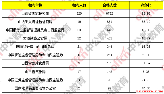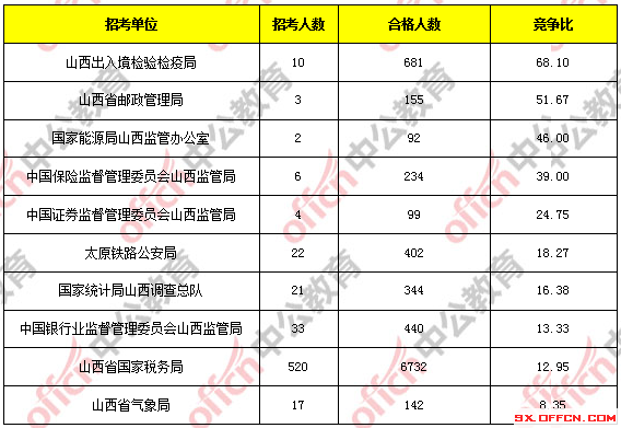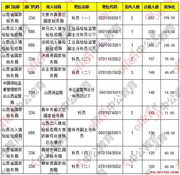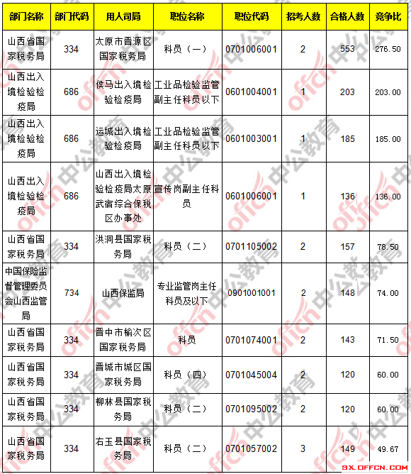 報考人數前十的職位主要集中在山西省國家稅務局、山西出入境檢驗檢疫局這兩個部門,具體信息如下: