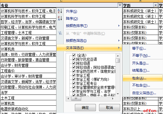 在“專業”一項中點擊下拉菜單,選擇“文本篩選”,選擇“包含”一項。