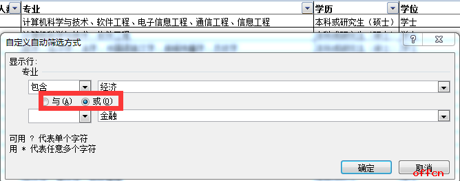 在“自定義自動篩選方式”的窗口中,填寫自己相關專業的名稱。