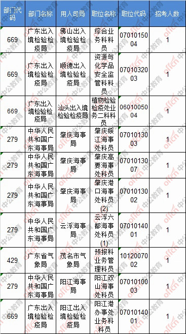 截止到20日8時,工作地點在廣東的職位共有80個無人報考,占全部職位的7.6%。下面是無人報考職位一覽表,中公網校專家建議廣大考生多關注一些較冷職位,避免激烈競爭,結合自身條件,找到屬于自己的職位。