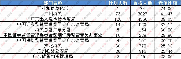 為幫助廣大考生更清晰的了解今日報名情況,廣東中公網校整理了審核通過人數前十位的部門以及競爭比例最激烈的十大部門,供廣大考生參考: