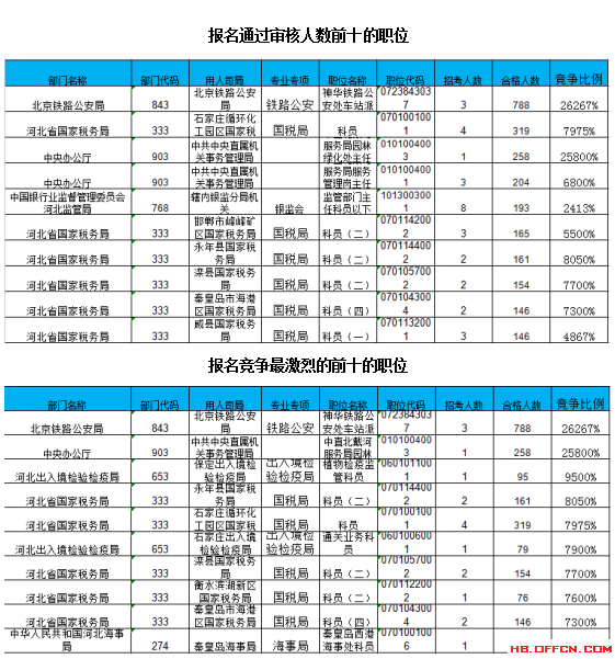 報(bào)名通過審核人數(shù)前十的職位主要集中在北京鐵路公安局、河北省國家稅務(wù)局、中央辦公廳等部門,具體信息如下: