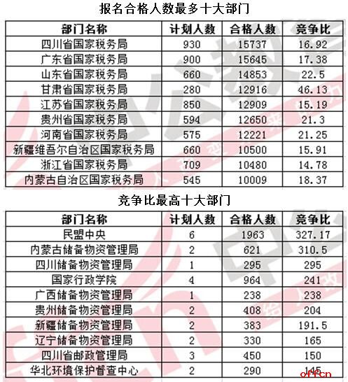 報名第6天,截至20日早8時,據中公網校統計已經有10個部門報名合格人數過萬人,這十個部門均為稅務部門。與昨天下午16時的數據相比,今天合格人數過萬的部門新增了浙江、內蒙、新疆國稅局,四川國稅由昨天下午的第三名躍居到了首位,超越了廣東、山東國稅,目前共有15737人報名,平均競爭比約17:1。