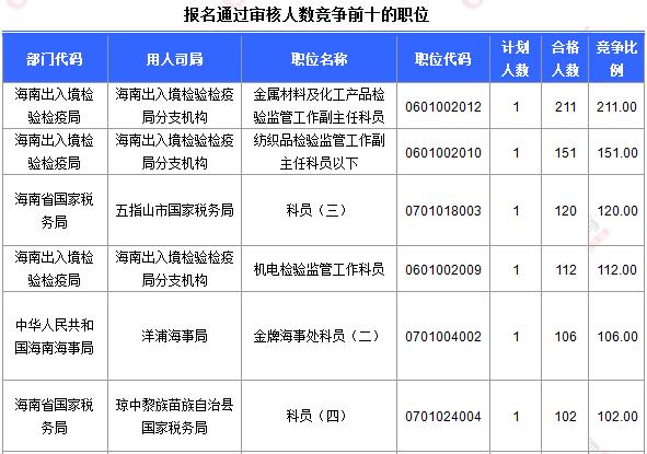 截止到20日8時,仍有21個職位無人報名,而熱門職位競爭卻是越來越激烈,其中報名人數最多的職位為:海南出入境檢驗檢疫局,金屬材料及化工產品檢驗監管工作副主任科員,共報名211人,競爭比例已高達211:1!