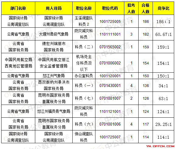 報名通過審核人數前十的職位主要集中在云南省氣象局、云南省國家稅務局、國家統計局云南調查總隊,具體信息如下: