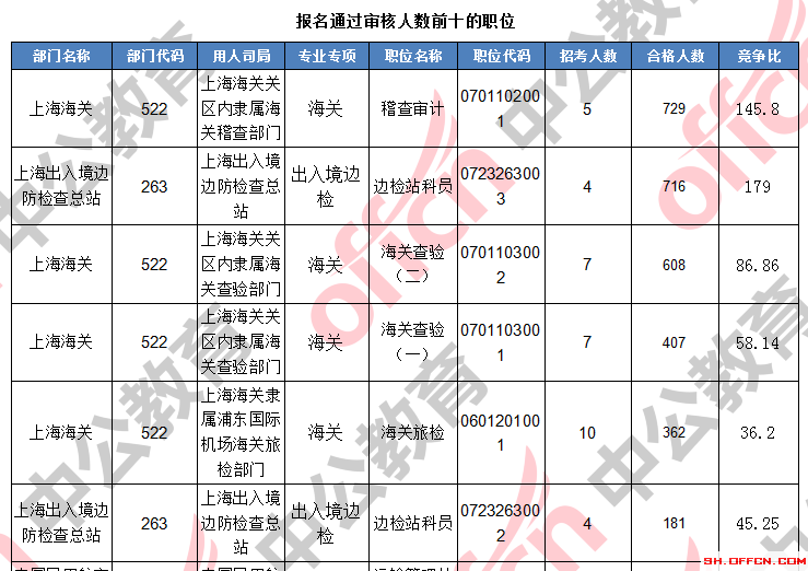 報名通過審核人數(shù)前十的職位主要集中在上海出上海海關、上海出入境邊防檢查總站、中國民用航空局華東地區(qū)管理局,具體信息如下:
