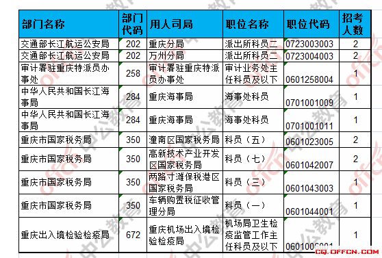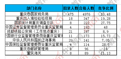 報名通過審核人數前十的職位主要集中在重慶市國家稅務局、重慶市出入境檢驗檢疫局等部門,具體信息如下: