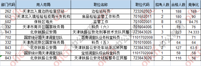 報名通過審核人數前十的職位主要集中在天津出入境邊防檢查總站、天津出入境檢驗檢疫局分支機構、保稅區海關,具體信息如下: