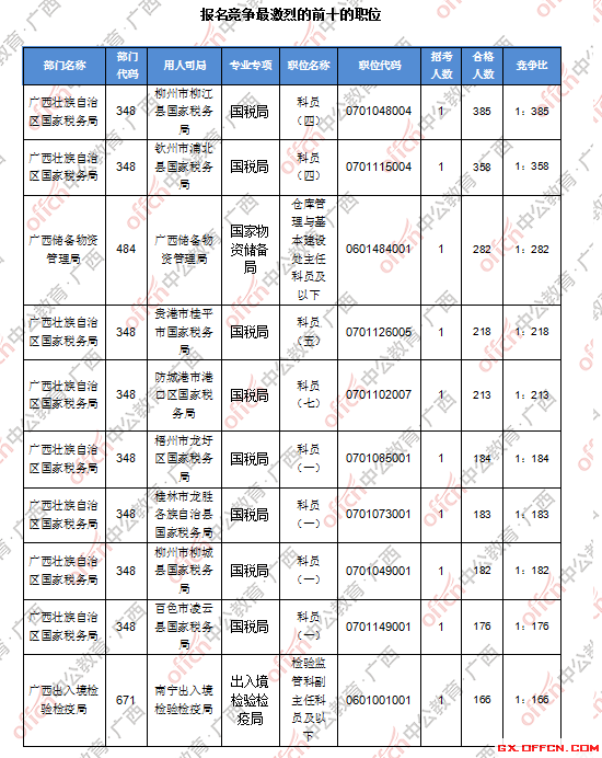 截止到20日16時,競爭比例的職位為柳州市柳江縣國家稅務局科員(四)一職,招錄1人,通過人數(shù)為385人,競爭比例385:1!