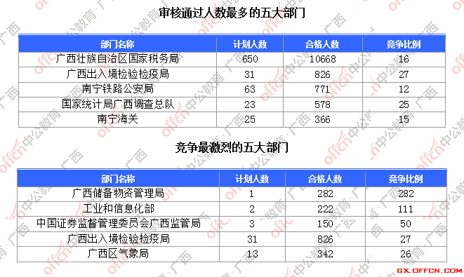 為幫助廣大考生更清晰的了解今日報名情況,廣西中公網(wǎng)校整理了審核通過人數(shù)前五位的部門以及競爭比例最激烈的五大部門,供廣大考生參考: