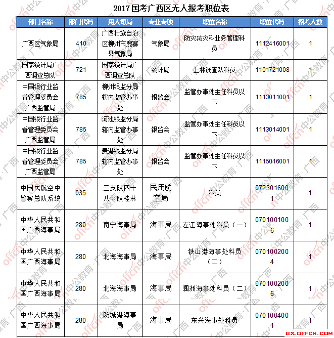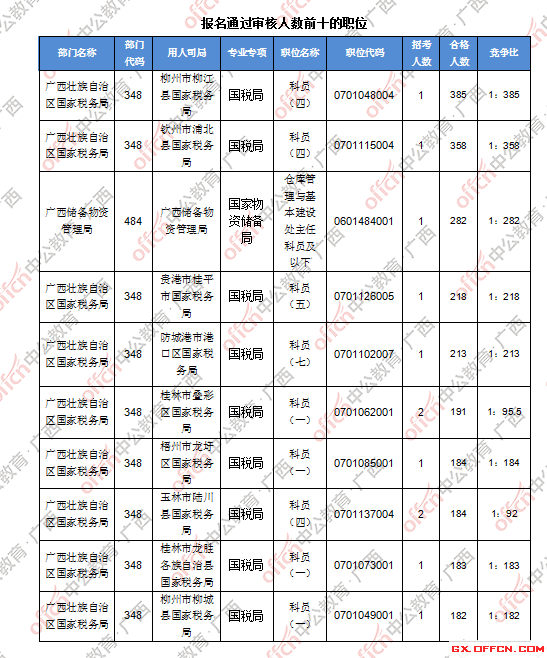 報名通過審核人數(shù)前十的職位主要集中在廣西壯族自治區(qū)國家稅務局、廣西儲備物資管理局等部門,具體信息如下:
