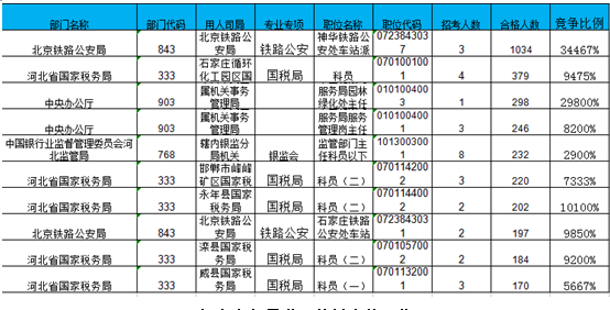報名通過審核人數前十的職位主要集中在北京鐵路公安局、河北省國家稅務局、中央辦公廳等部門,具體信息如下: