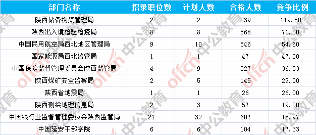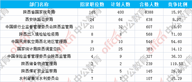 為幫助廣大考生更清晰的了解今日報名情況,陜西中公網校整理了審核通過人數前十位的部門以及競爭比例最激烈的十大部門,供廣大考生參考: