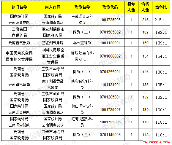 截止20日16時,競爭最激烈的職位為國家統計局云南調查總隊_國家統計局云南調查總隊(玉溪調查隊科員2),職位代碼1001725005,招錄1人,通過人數為215人,215:1。
