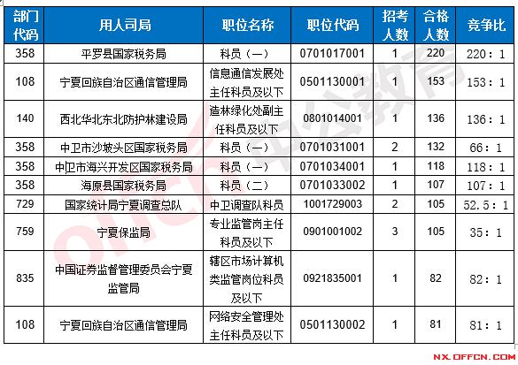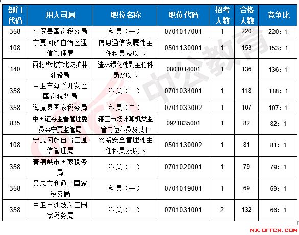 截止到20日16時,競爭比例的職位為平羅縣國家稅務局科員(一)一職,招錄1人,截止到20日16時合格人數為220人,具體信息如下: