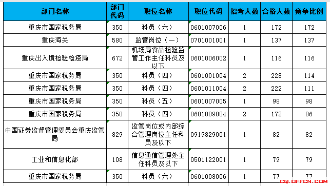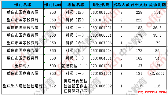 合格人數(shù)前十的職位主要集中在重慶市國(guó)家稅務(wù)局、重慶海關(guān)、重慶出入境檢驗(yàn)檢疫局等部門,具體信息如下: