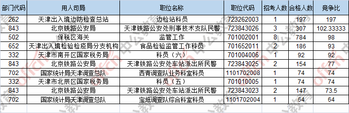 報名通過審核人數前十的職位主要集中在保稅區海關、北京鐵路公安局、天津出入境邊防檢查總站,具體信息如下: