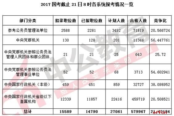 下面,中公網校專家將具體分析截至21日8時的2017國考報名數據。