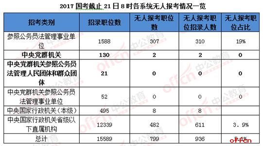 中央黨群機關僅有二職位無人過審,分別為中共中央對外聯絡部辦公廳檔案管理(職位代碼101002001)和中共中央對外聯絡部二局蒙古語翻譯(職位代碼102004002),第一個職位要求2年基層工作經驗,檔案學本科學歷,中共黨員,而第二個職位不限基層工作經歷,專業為蒙古語,本科或研究生學歷,中共黨員身份,需要加試專科科目。這兩個職位要求都相對具體,由于所需專業本身的人數就不多,加上其他要求的限制也成為它至今未破零的原因。