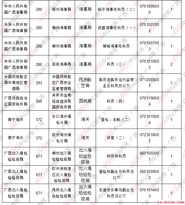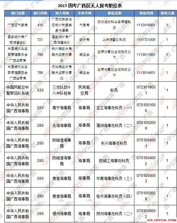 截止到21日8時,工作地點在廣西的職位共有23個無人報考,占全部職位的3.6%。下面是部分廣西無人報考職位一覽表,廣西中公網(wǎng)校專家建議廣大考生結(jié)合自身條件,根據(jù)自己的實際情況找到屬于自己的職位,避免激烈競爭。