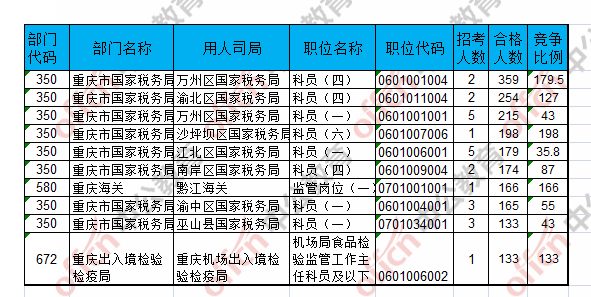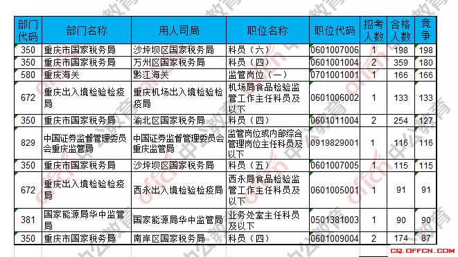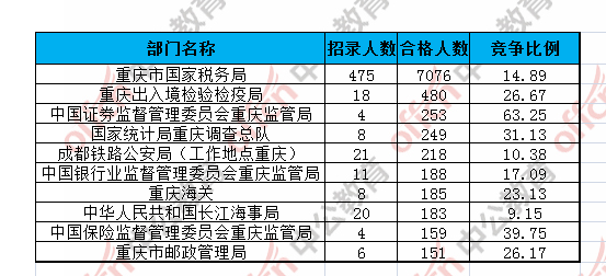 為幫助廣大考生更清晰的了解今日報名情況,重慶中公網校整理了審核通過人數前十位的部門以及競爭比例最激烈的十大部門,供廣大考生參考: