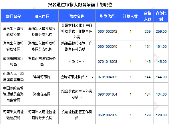 截止到21日8時,仍有13個職位無人報名,而熱門職位競爭卻是越來越激烈,其中報名人數最多的職位為:海南出入境檢驗檢疫局,金屬材料及化工產品檢驗監管工作副主任科員,共報名259人,競爭比例已高達259:1!