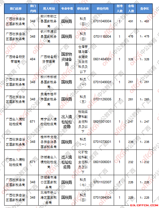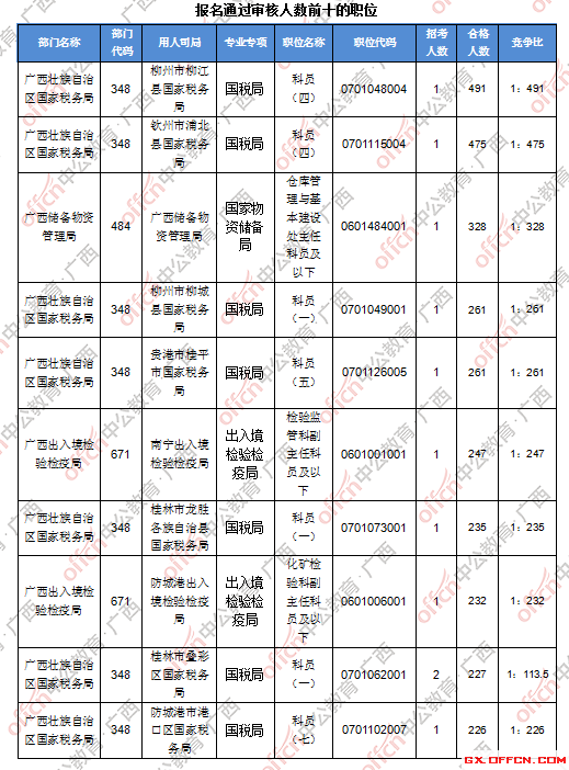報名通過審核人數前十的職位主要集中在廣西壯族自治區國家稅務局、廣西儲備物資管理局、廣西出入境檢驗檢疫局等部門,具體信息如下: