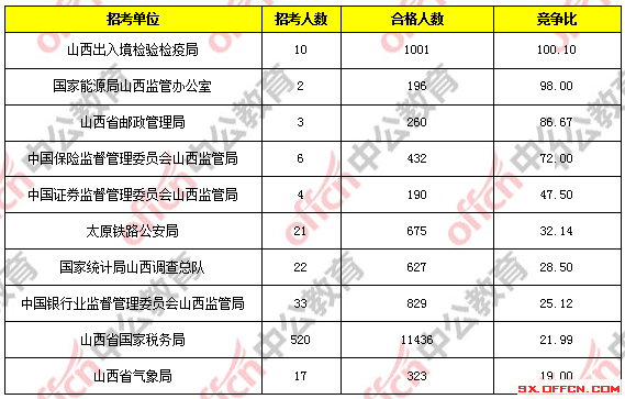 為幫助廣大考生更清晰的了解今日報名情況,山西中公網校整理了合格人數前十位的部門以及競爭比例最激烈的十大部門,供廣大考生參考: