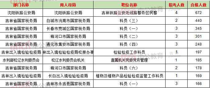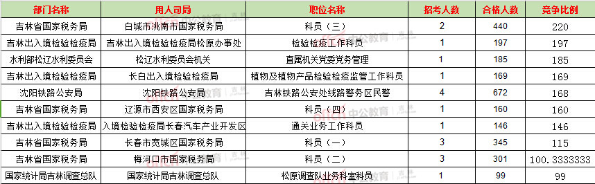 截止到21日16時,競爭比例的職位為吉林鐵路公安處線路警務區民警一職,招錄4人,截止到21日16時通過人數為672人。其次為吉林省國稅局部門。