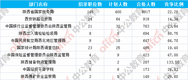 為幫助廣大考生更清晰的了解今日報名情況,陜西中公網校整理了審核通過人數前十位的部門以及競爭比例最激烈的十大部門,供廣大考生參考: