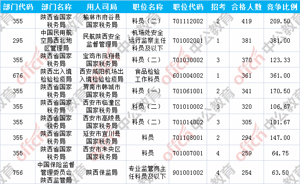 報名通過審核人數前十的職位主要集中在陜西出入境檢驗檢疫局、陜西省國家稅務局、中國民用航空局西北地區管理局等部門,具體信息如下: