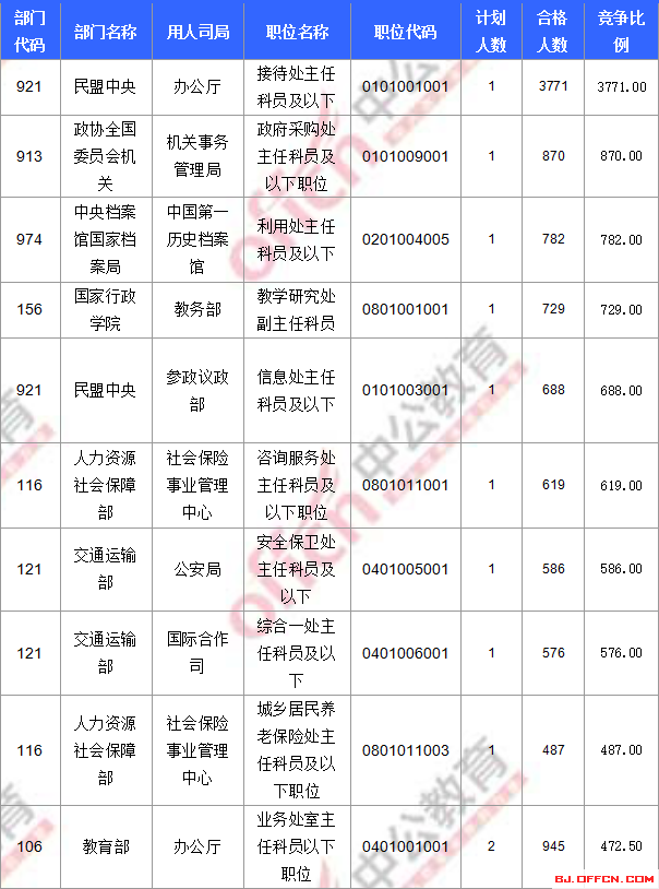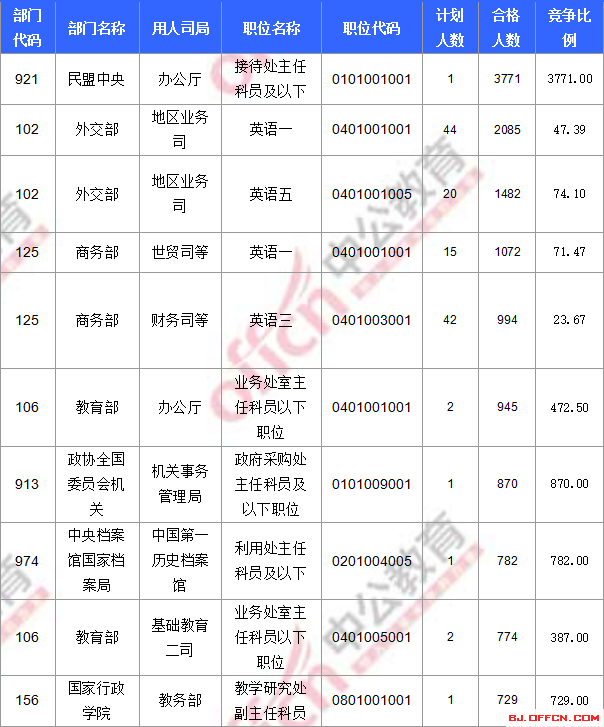 合格人數前十的職位主要集中在外交部、民盟中央、商務部等部門,具體信息如下: