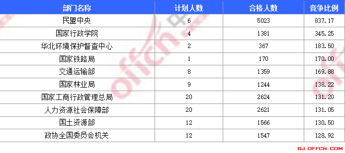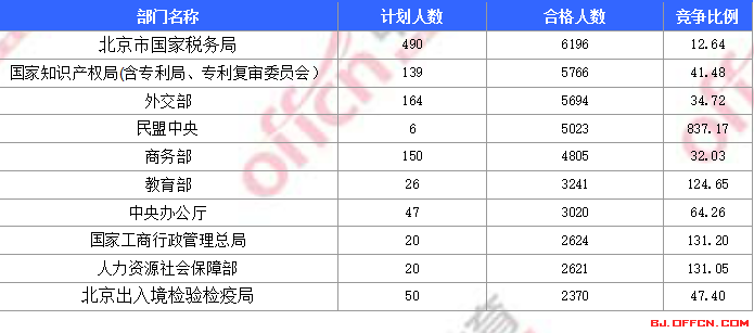 為幫助廣大考生更清晰的了解今日報名情況,北京中公網校整理了合格人數前十位的部門以及競爭比例最激烈的十大部門,供廣大考生參考: