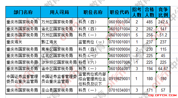 報名通過審核人數前十的職位主要集中在萬州區國家稅務局、渝北區國家稅務局、黔江海關等部門,具體信息如下: