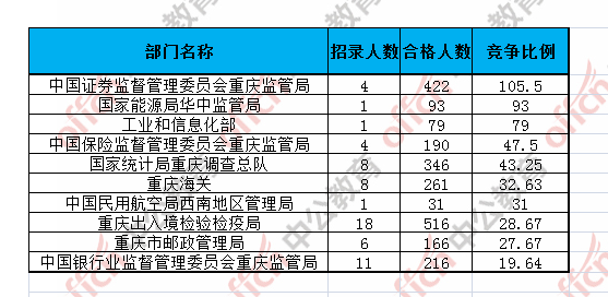 為幫助廣大考生更清晰的了解今日報名情況,重慶中公網校整理了審核通過人數前十位的部門以及競爭比例最激烈的十大部門,供廣大考生參考: