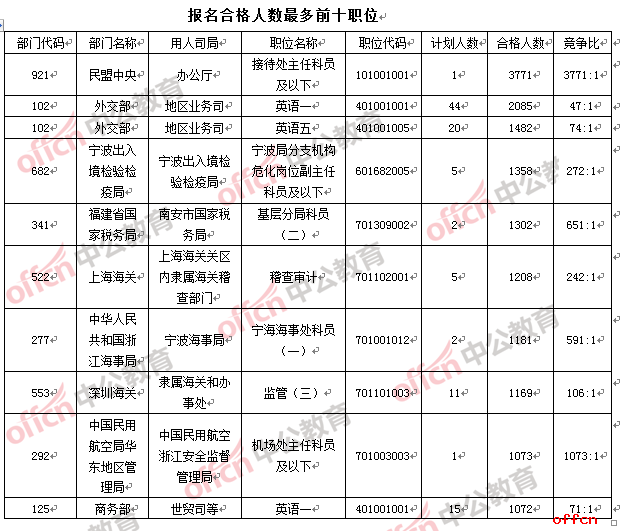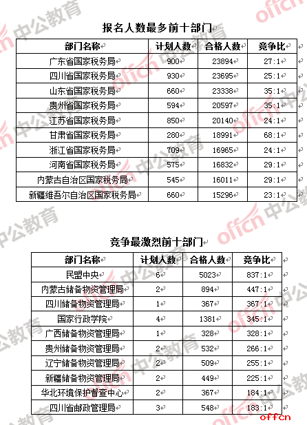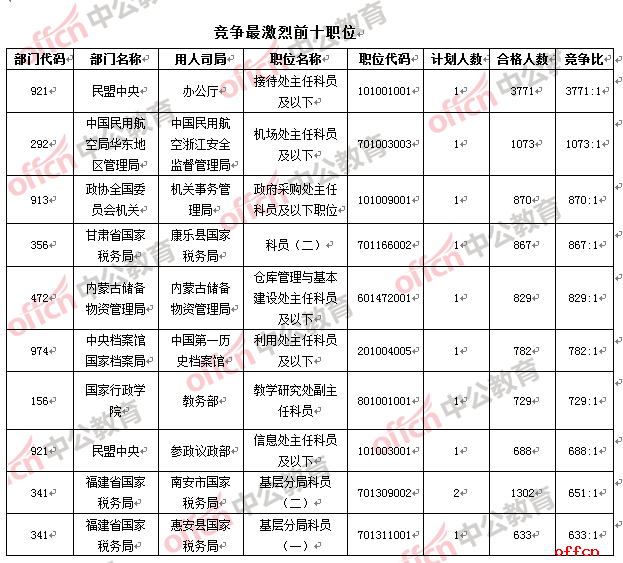 與去年同期競爭最激烈部門的584:1相比,今年的民盟中央的競爭比達到837:1,成為今年競爭比“破八百”的部門,遠拋與排名第二內蒙古物管局的447:1。在競爭最激烈的前十部門中,物管局站席6個,物管局成為眾多考生未來職業發展的“理想之所”。