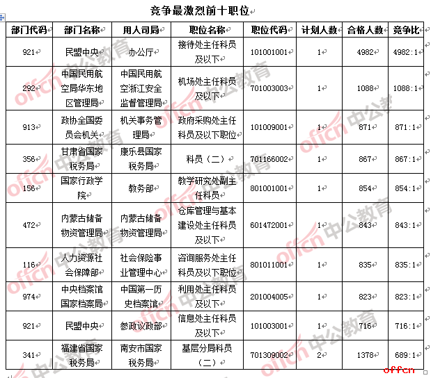 從競(jìng)爭(zhēng)比上來(lái)看,與去年同期只有7個(gè)部門(mén)超過(guò)800:1相比,今年有8個(gè)職位“順利過(guò)關(guān)”。但從整體上來(lái)看,今年報(bào)考職位的“熱冷兩重天”的特點(diǎn)突顯,最熱職位或可超5000大關(guān),而在競(jìng)爭(zhēng)比排行榜中排名第二的職位僅1088:1,兩者可謂“天淵之別”。